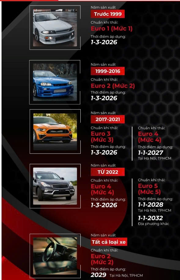 Từ ngày 1 tháng 1 năm 2029, xe ô tô tham gia giao thông trên địa bàn thành phố Hà Nội và Thành phố Hồ Chí Minh phải đáp ứng quy định về khí thải từ mức 2 trở lên;