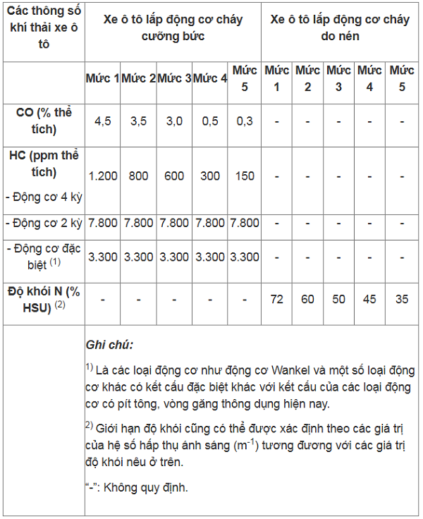 Giá trị tối đa các thông số khí thải ô tô: